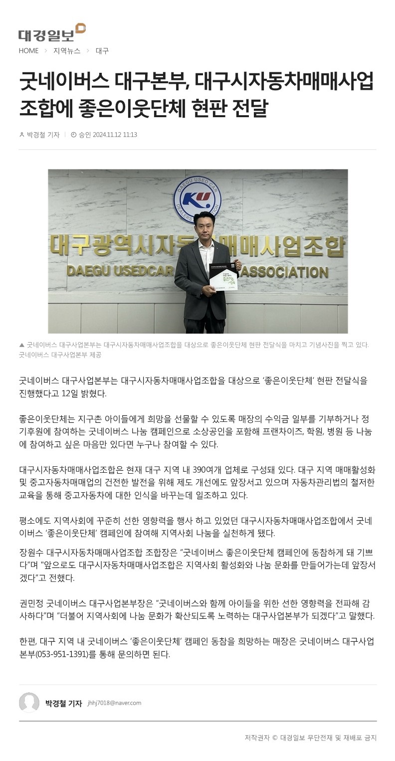 대경일보 언론보도(2024.11.12) - 굿네이버스 대구본부, 대구광역시자동차매매사업조합에 좋은이웃단체 현판 전달